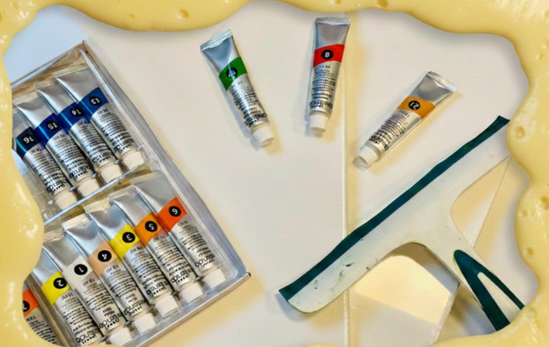 À l’aide d’une simple raclette à vitre, les enfants étalent, superposent et raclent la peinture pour créer des effets de matière, de mouvement et de couleur.